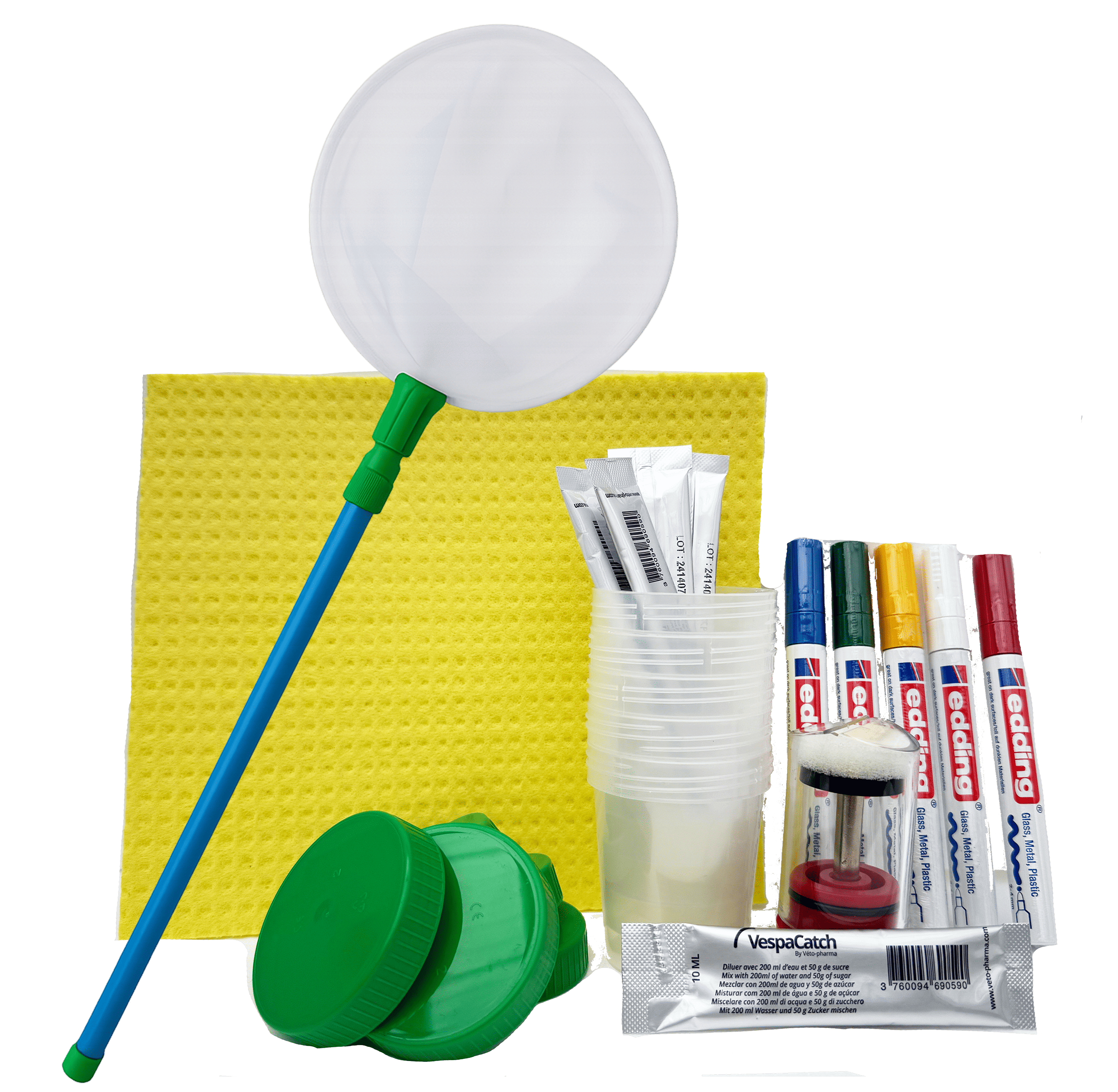 Bestehend aus: 5 x Locktöpfe 1 x Kescher 5 x Lockstoff 1 x Schwammtuch 1 x Zeichenstift- Set (5 Farben) 1 x Zeichengerät Flyer & Anleitungen der Velutina Army.